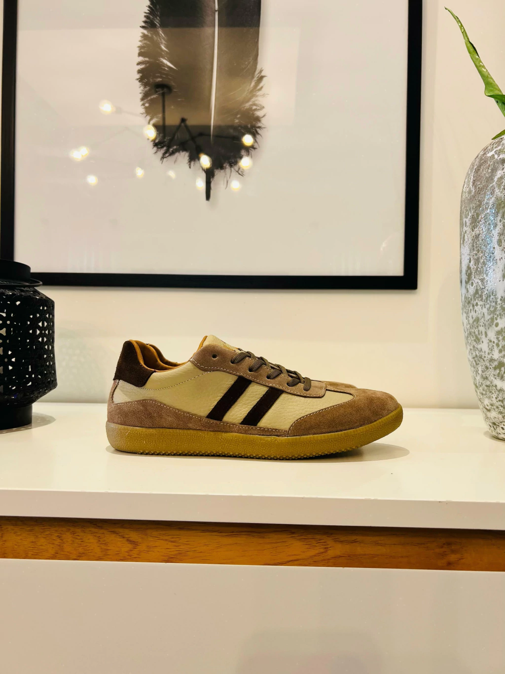 Zapatilla confeccionada en gamuza visón con detalles en gamuza marrón oscura. Interior forrado en cuero vacuno. Base de TR super liviana y flexible.